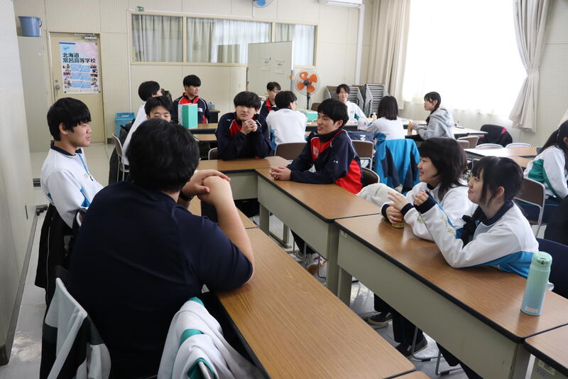 1月8日(木)に、地域連携協力校である北見北斗高校の生徒会の皆さんと生徒会交流会を実施しました。午前はアドヴィックス常呂カーリングホールで常呂高校生と一緒にカーリングの練習や試合を和気あいあいと楽しみました。午後は、常呂高校視聴覚教室で昼食を取り、くじ引き形式でトークテーマを設定する交流会を行いました。両校の生徒会活動や運営等について積極的で活発な意見交換がみられ、今後につながるとても有意義な時間となりました。