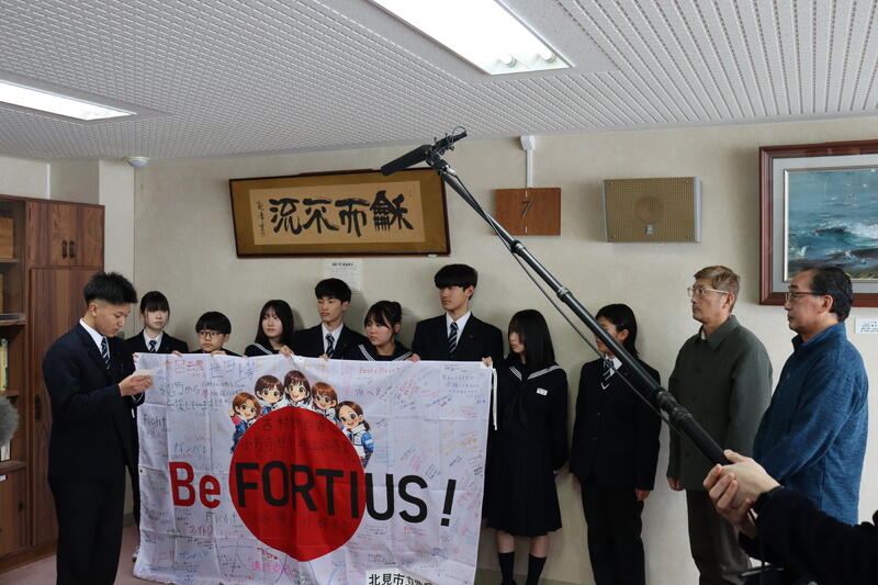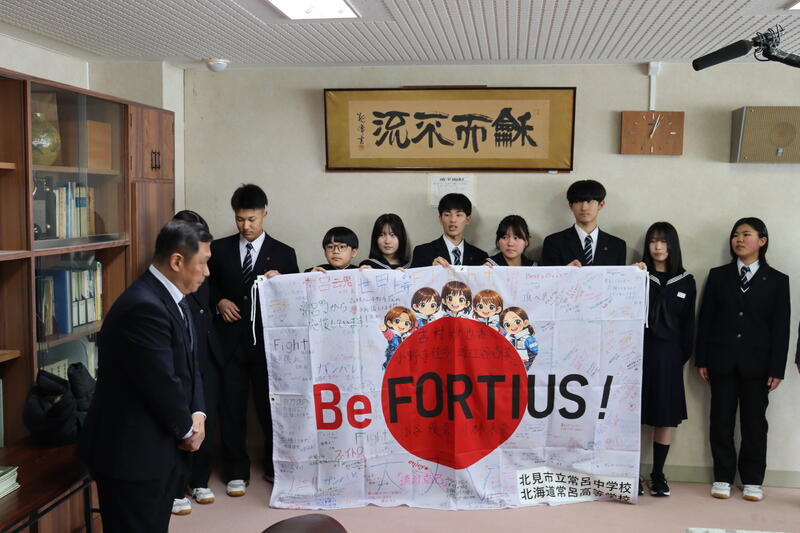 応援旗は、常呂高校・常呂中学校合同で、寄せ書きをして作成しました。そして、応援旗を生徒会書記局と常呂中学校生徒会合同で中学校校長室で近江谷さん、小野寺さんへ応援メッセージと共に手交しました。