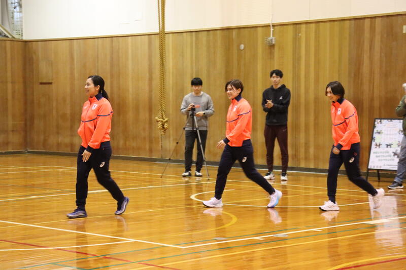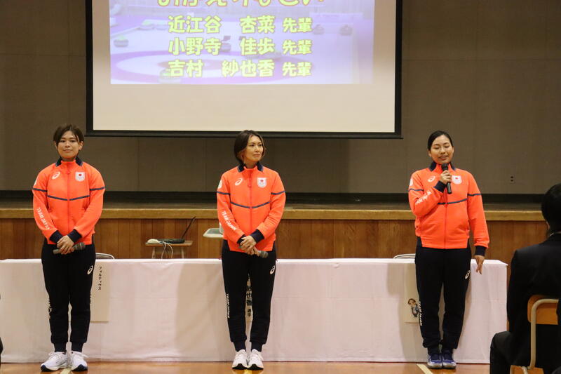 帰国報告会には、スキップ吉村紗也香選手、サード小野寺佳歩選手、リード近江谷杏菜選手の3人が登場され、冬季五輪からの帰国報告をしていただきました。報告会後半の質問コーナーでは、3人の選手から冬季五輪での出来事やそれぞれが思うカーリングの魅力などお話しいただきました。