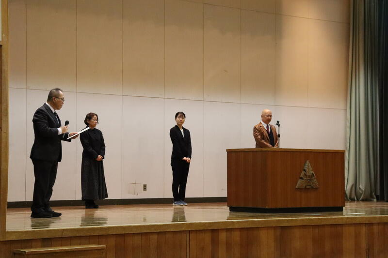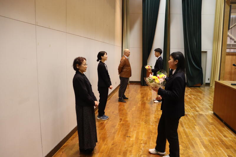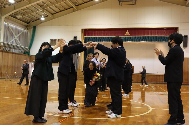 離任式では、お別れする3名の先生方から最後のご挨拶をいただき、生徒から感謝の花束を贈りました。最後は生徒たちが作ったアーチの中を笑顔で通り、温かな雰囲気の中で先生方を送り出すことができました。